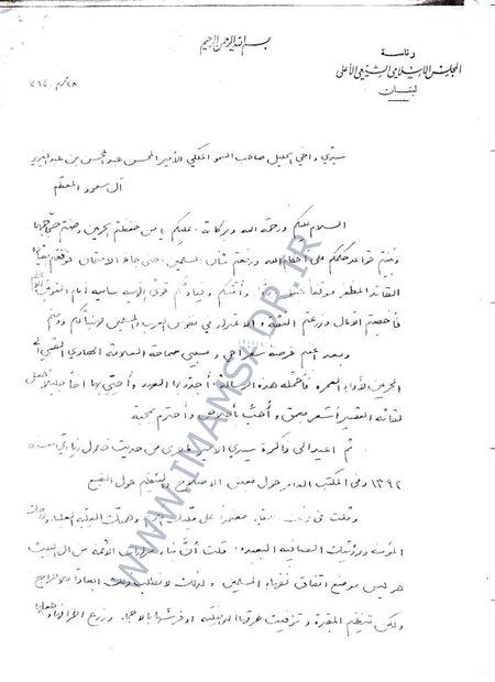 در اینجا، سفر برادر و خویشاوند خود حضرت علامه هادی قمی را برای ادای عمره غنیمت میشمرم و این نامه را بدو میسپارم تا به وسیله آن پیمانم را تجدید کنم و به برادری گرامی که دیدار کوتاهش باعث شد احساسی عمیق و دوست داشتنی با اخلاص و احترامی همراه با محبت داشته باشم، سلامی برسانم و سپس، گفتوگویی را به آن سرور شاهزاده یادآوری کنم که در دیدار سال ۱۳۹۲ در دفتر جنابعالی درباره برخی تعمیرات و سازماندهیهای اطراف بقیع داشتیم.