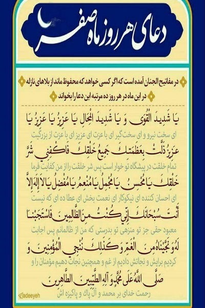 همچنین، خواندن دعای ویژه ماه صفر نیز از دیگر توصیههای معصومین(ع) برای رفع بلا و سنگینی این ماه است. بنا بر روایات، خواندن روزی ۱۰ مرتبه دعای ویژه ماه صفر تأثیر بسزایی در رفع مشکلات و سنگینی این ماه دارد.