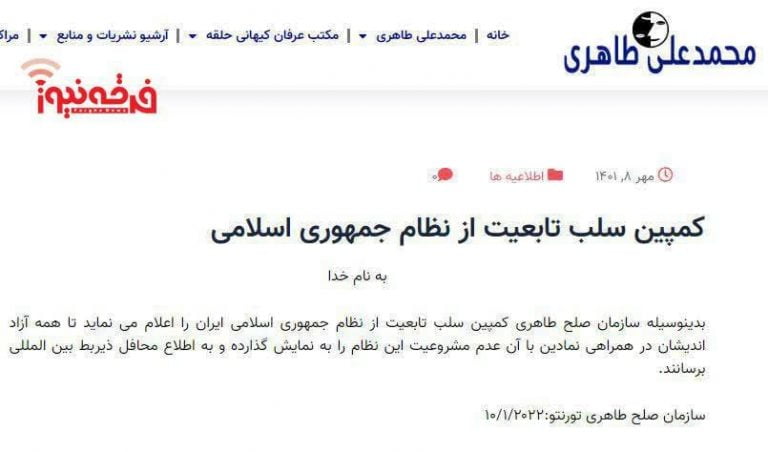 این روزها که منافقین و تروریست ها در کشور آشوب به راه انداخته اند نیز شاهد موضع گیری خصمانه پیروان این عرفان و شخص محمد علی طاهری در قبال دولت و ملت ایران هستیم تا جایی که در رسانه های منتسب به این مکتب انحرافی کمپین«سلب تابعیت از نظام جمهوری اسلامی ایران» به راه انداخته اند.