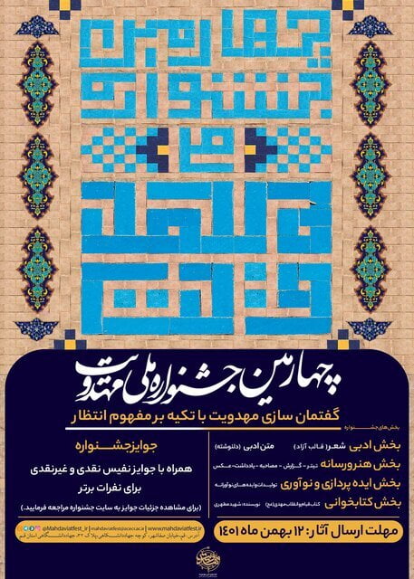 لازم به ذکر است، علاقهمندان برای شرکت در چهارمین جشنواره ملی مهدویت و کسب اطلاعات بیشتر میتوانند به وبسایت جشنواره ملی مهدویت به آدرس www.Mahdaviatfest.ir مراجعه کنند.