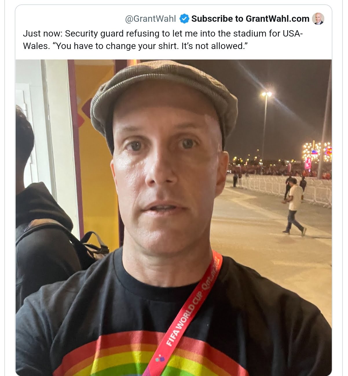 گرانت وال، روزنامه نگار آمریکایی که مسابقات جام جهانی فوتبال در قطر را پوشش می داد، گزارش داد: وقتی که امروز برای بازی آمریکا و ولز رفته بود، به دلیل پوشیدن پرچم همجنس گرایان به مدت کوتاهی دستگیر شد.