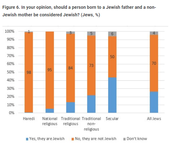 این پرسش، سؤال همیشگی فضای دینی و مذهبی اسرائیل و صهیونیستها بوده است. در پاسخ به این سؤال کهیهودی کسی است که تنها پدرشیهودی بوده و از مادریهودی متولد نشده پرسیده شده که ۷۰ درصد با این مسأله مخالفت کردهاند و بریهودی بودن مادر براییهودی دانستن فرد تأکید کردهاند. با اینکه سؤالکننده سؤال را برعکس پرسیده است، اما با اینها نتایج نشان میدهد: