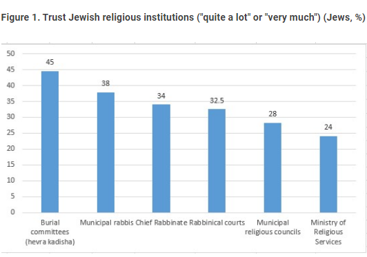 نتایج نشان می دهد بیشترین اعتماد به کمیته های تدفین مذهبی وجود دارد که آن هم در بین سکولارها که جمعیت زیادی از اسرائیل را تشکیل می دهند بیشتر از ۲۵% درصد نمی رود. با توجه به این مسئله که سهم سکولارها در جامعه اسرائیلی بسیار بالاست، پایین بودن اعتماد آنان به نهادهای دینی بسیار اهمیت می یابد، جدا از اینکه اختلاف آن با حریدی ها نشان دهنده شکاف مذهبی-سکولارها در اسرائیل است.
