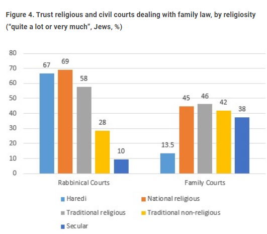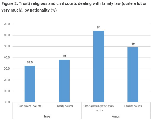یهودیها اعتمادشان به دادگاه مذهبی ۳۲.۵% و به دادگاه خانواده تنها ۲۸% بوده است. این رقم برای اعراب اسرائیلی به ترتیب ۶۴% و ۴۹% است.