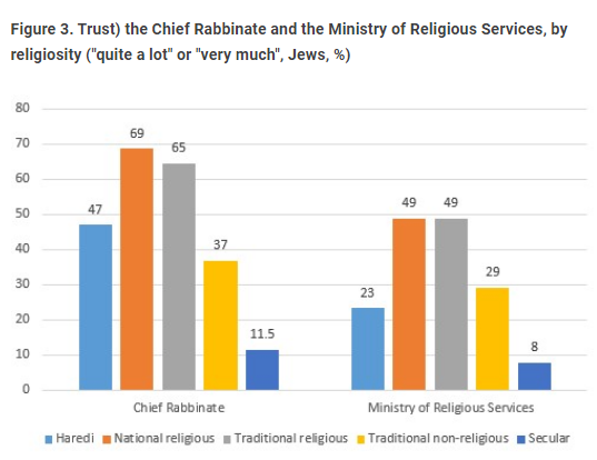 نتایج بالا یک نتیجه بسیار مهم دارد و آن هم میزان اعتماد بین گروه های مختلف به خاخام و وزرات دینی بالاخص میان سکولارها و دیگران است. چیزی که نشان می دهد شکاف سکولارها و مذهبی ها در اسرائیل بسیار جدی است. اما نکته مهم دیگر عدم رضایت قابل قبول حریدی ها از خاخام اعظم است.