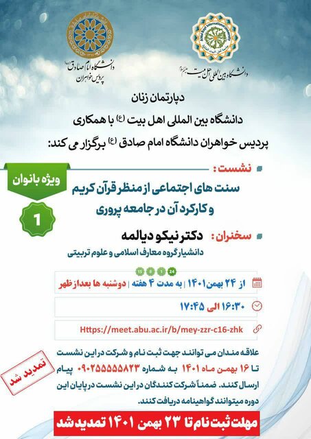 نشست علمی “سنتهای اجتماعی از منظر قرآن کریم و کارکرد آن در جامعهپروری” به همت دپارتمان زنان دانشگاه بینالمللی اهل بیت (ع) و دانشگاه امام صادق علیه السلام پردیس خواهران برگزار میشود.