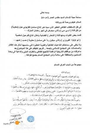 هفته گذشته در واکنش به برنامه عربستان برای پخش سریالی ضدشیعی در حساب توییتری مقتدی صدر آمده است: معاویه نماینده اهل تسنن نیست؛ همانگونه که ابولؤلؤ مظهر شیعیان نیست و بنابراین پخش هر دو سریال باید ممنوع باشد.