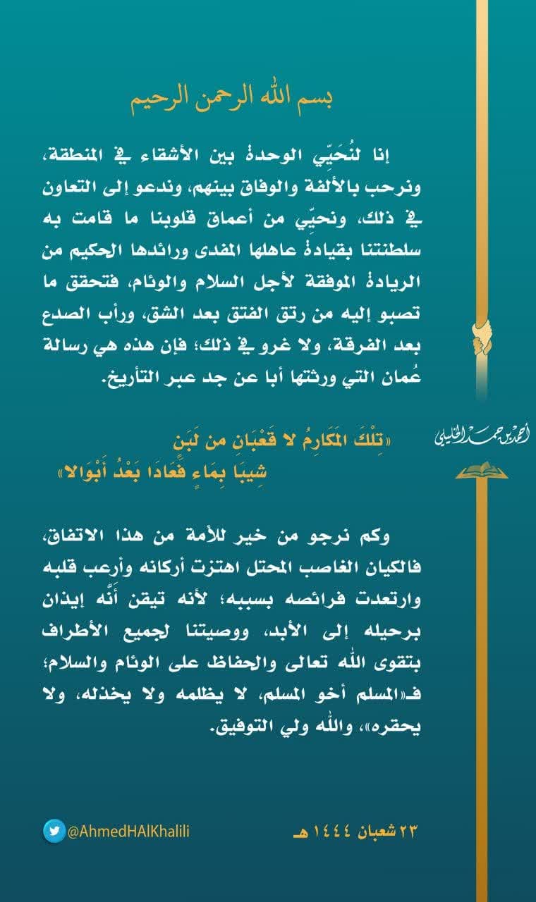به گزارش ردنا (ادیان نیوز)، شیخ احمد بن حمد الخلیلی- مفتی اعظم سلطان نشین عمان – در توییتی «با تبریک اتحاد میان برادران در منطقه و استقبال از همبستگی و وفاق بین آنها» گفت پس از توافق اخیر عربستان و جمهوری اسلامی ایران در پایتخت چین، پایههای دولت اسرائیل به لرزه درآمد و قلبش به وحشت افتاد.