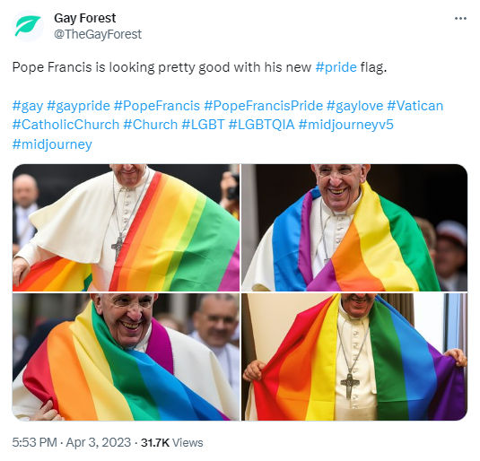 از این گذشته، اکانتی با عنوان «Gay Forest» در فیسبوک و توییتر این تصویر پاپ را در ۳ آوریل ۲۰۲۳ (۱۴ فروردین ۱۴۰۲) به همراه چند عکس مشابه دیگر از پاپ با هشتگ‌های #midjourne و #midjourneyv5 به اشتراک گذاشته که اشاره‌ای به نام برنامه‌ای با همین نام برای ایجاد تصاویر با استفاده از هوش مصنوعی است.