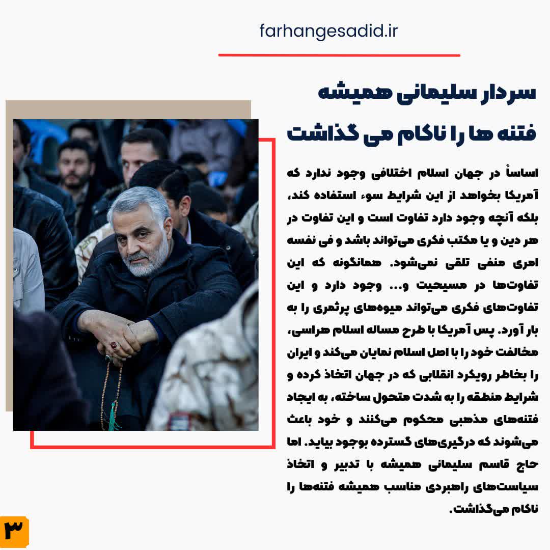 باور “مکتب شهید سلیمانی” که اساساً در جهان اسلام اختلافی وجود ندارد که آمریکا بخواهد از این شرایط سوء استفاده کند، بلکه آنچه وجود دارد تفاوت است و این تفاوت در هر دین و یا مکتب فکری میتواند باشد و فی نفسه امری منفی تلقی نمیشود. همانگونه که این تفاوتها در مسیحیت و… وجود دارد و این تفاوتهای فکری میتواند میوههای پرثمری را به بار آورد. پس آمریکا با طرح مساله اسلام هراسی، مخالفت خود را با اصل اسلام نمایان میکند و ایران را بخاطر رویکرد انقلابی که در جهان اتخاذ کرده و شرایط منطقه را به شدت متحول ساخته، به ایجاد فتنههای مذهبی محکوم میکنند و خود باعث میشوند که درگیریهای گسترده بوجود بیاید.