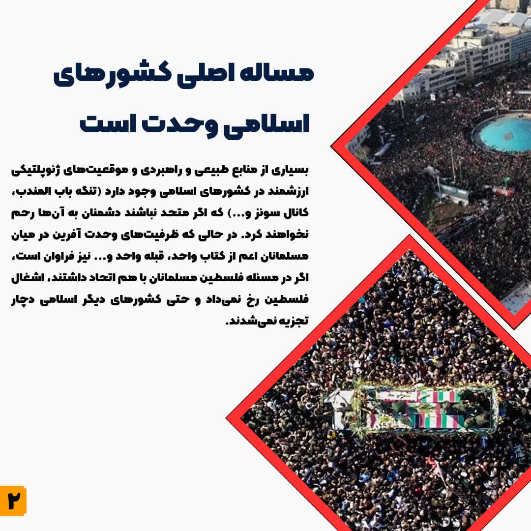 بسیاری از منابع طبیعی و راهبردی و موقعیتهای ژئوپلتیکی ارزشمند در کشورهای اسلامی وجود دارد (تنگه باب المندب، کانال سوئز و…) که اگر متحد نباشند دشمنان به آنها رحم نخواهند کرد. در حالی که ظرفیتهای وحدت آفرین در میان مسلمانان اعم از کتاب واحد، قبله واحد و… نیز فراوان است، اگر در مسئله فلسطین مسلمانان با هم اتحاد داشتند، اشغال فلسطین رخ نمیداد و حتی کشورهای دیگر اسلامی دچار تجزیه نمیشدند.