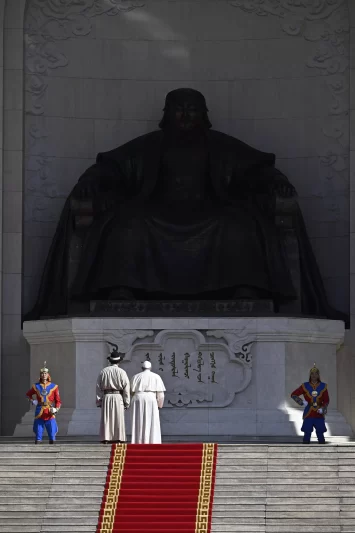 به گزارش ردنا (ادیان نیوز)، در مراسم رسمی استقبال، رییس جمهور مغولستان -اوخنا خورلسوخ- که لباس سنتی مغولها را پوشیده بود به پاپ فرانسیس 86 ساله خوش آمد گفت و هر دو به تندیس بزرگ چنگیزخان مغول ادای احترام کردند.