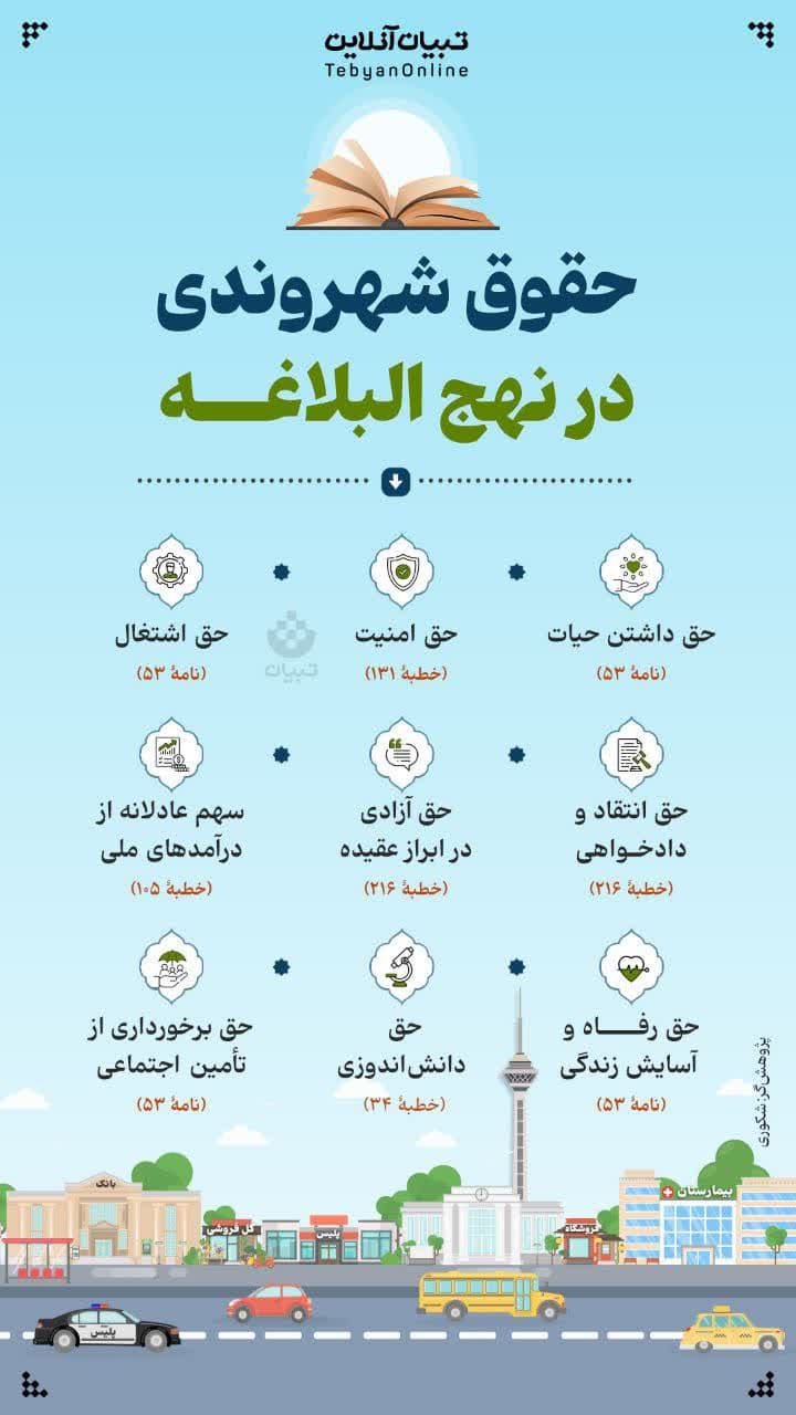 به گزارش ردنا (ادیان نیوز)، حقوق شهروندی در نهج البلاغه به روایت اینفوگرافیک تقدیم حضور مخاطبین ارجمند می شود. به طوری که ۱۴۰۰ سال پیش دین اسلام به ارکان مهم و اساسی در حقوق شهروندی و وظایف آن در جامعه پرداخته است. به طوری که حق انتقاد و دادخواهی، حق رفاه و آسایش جزئی از انان است.