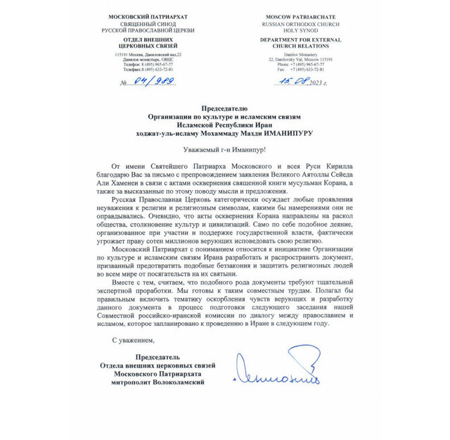 از طرف عالیجناب کریل اسقف اعظم مسکو و تمام روسیه از شما به خاطر ارسال بیانیه حضرت آیتالله العظمی سید علی خامنهای در رابطه با هتک حرمت به کتاب مقدس مسلمانان، قرآن کریم و همچنین برای نظرات و پیشنهادات جنابعالی در این مورد تشکر میکنم.