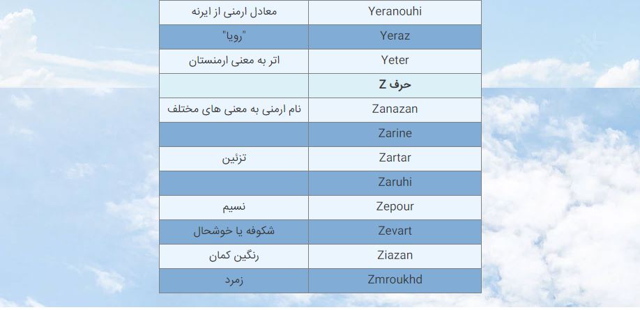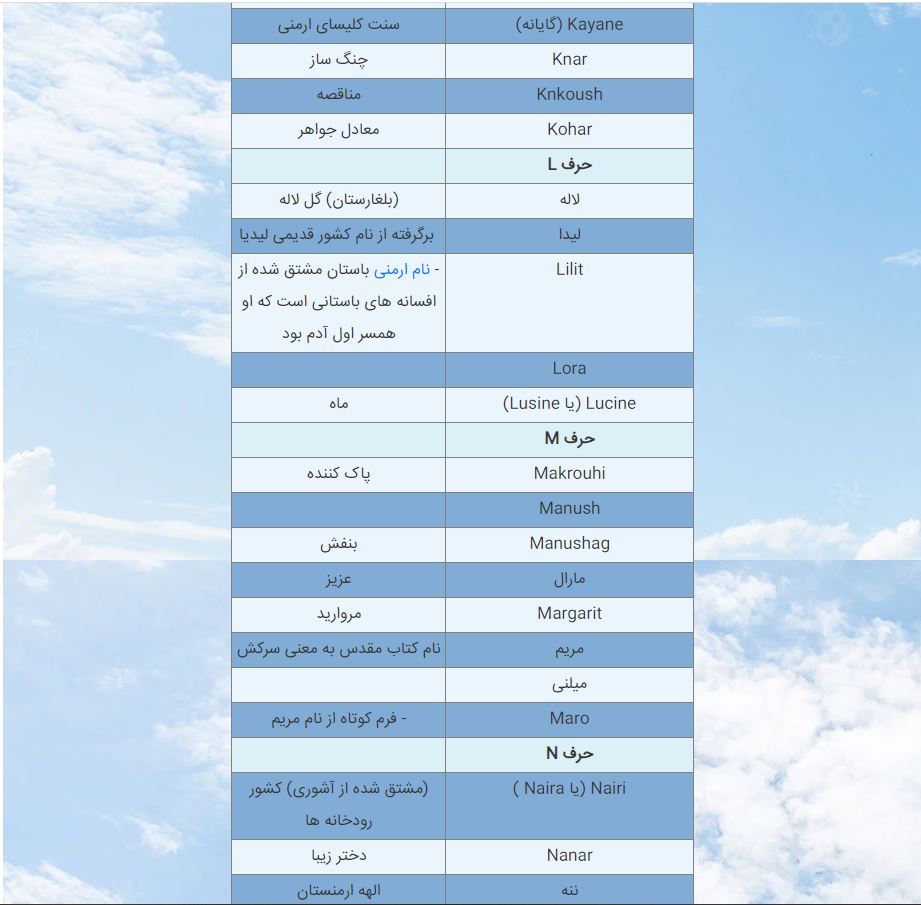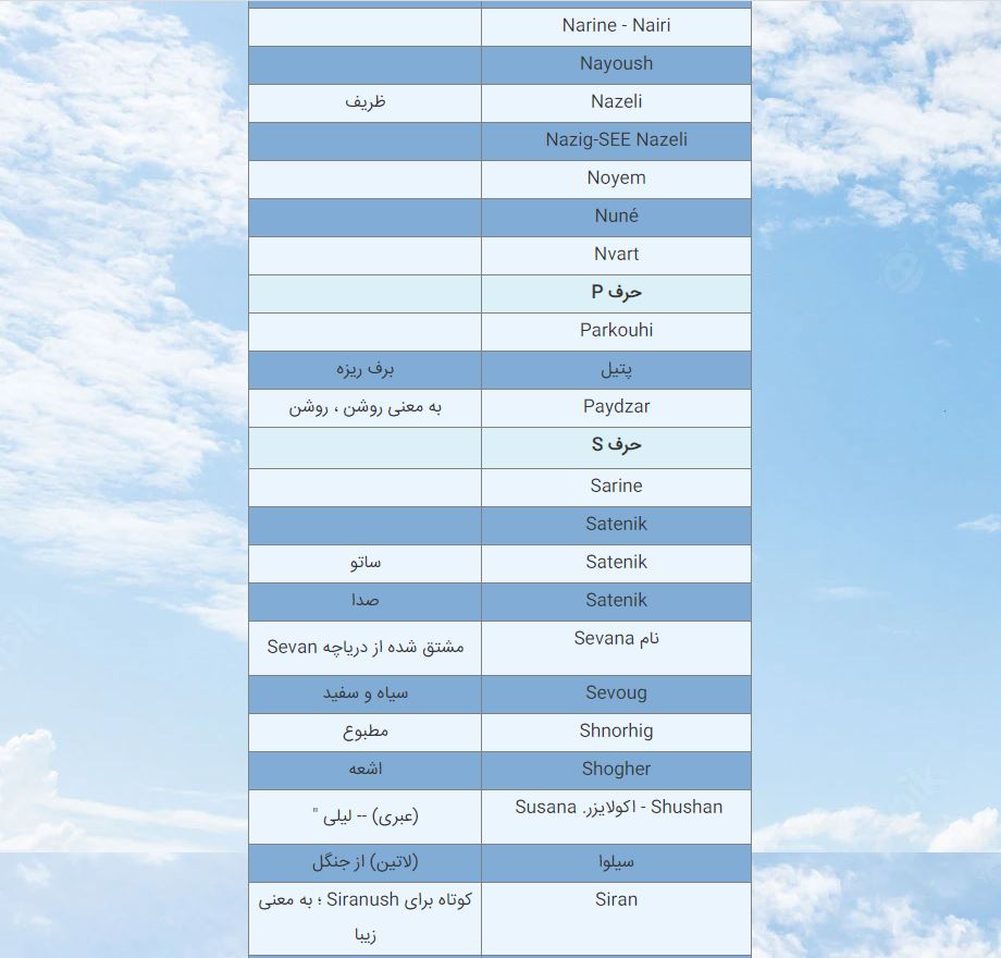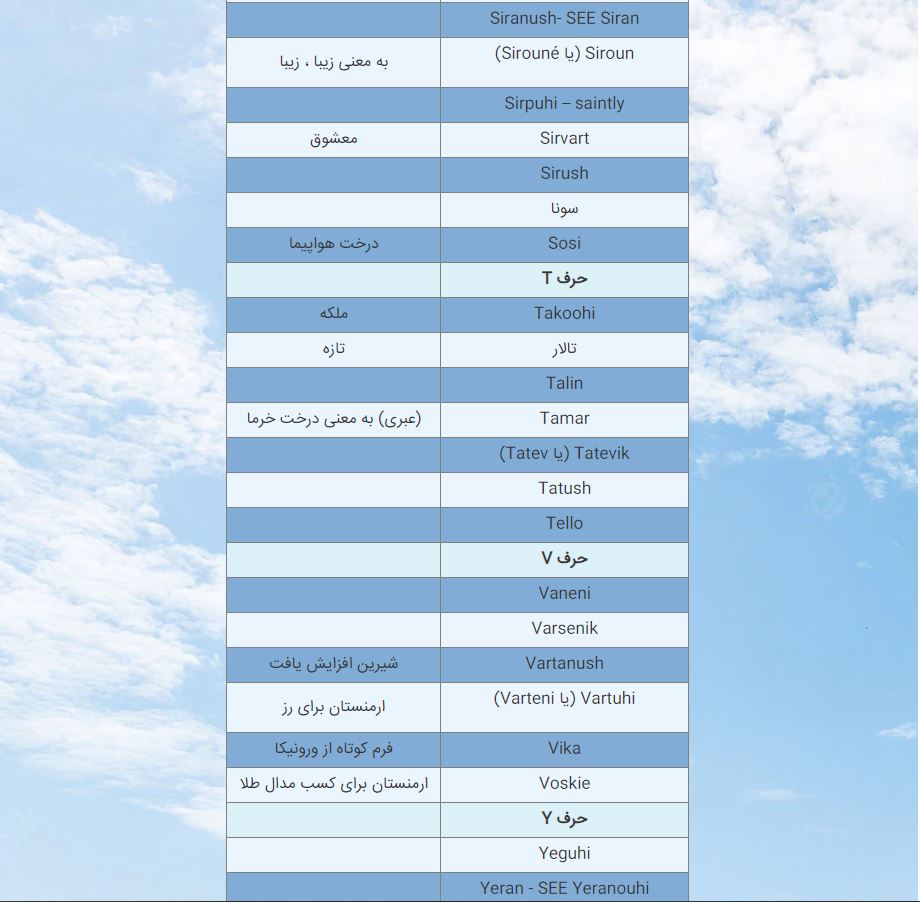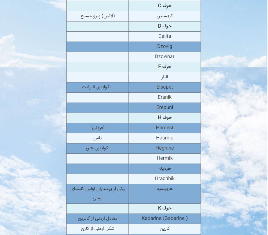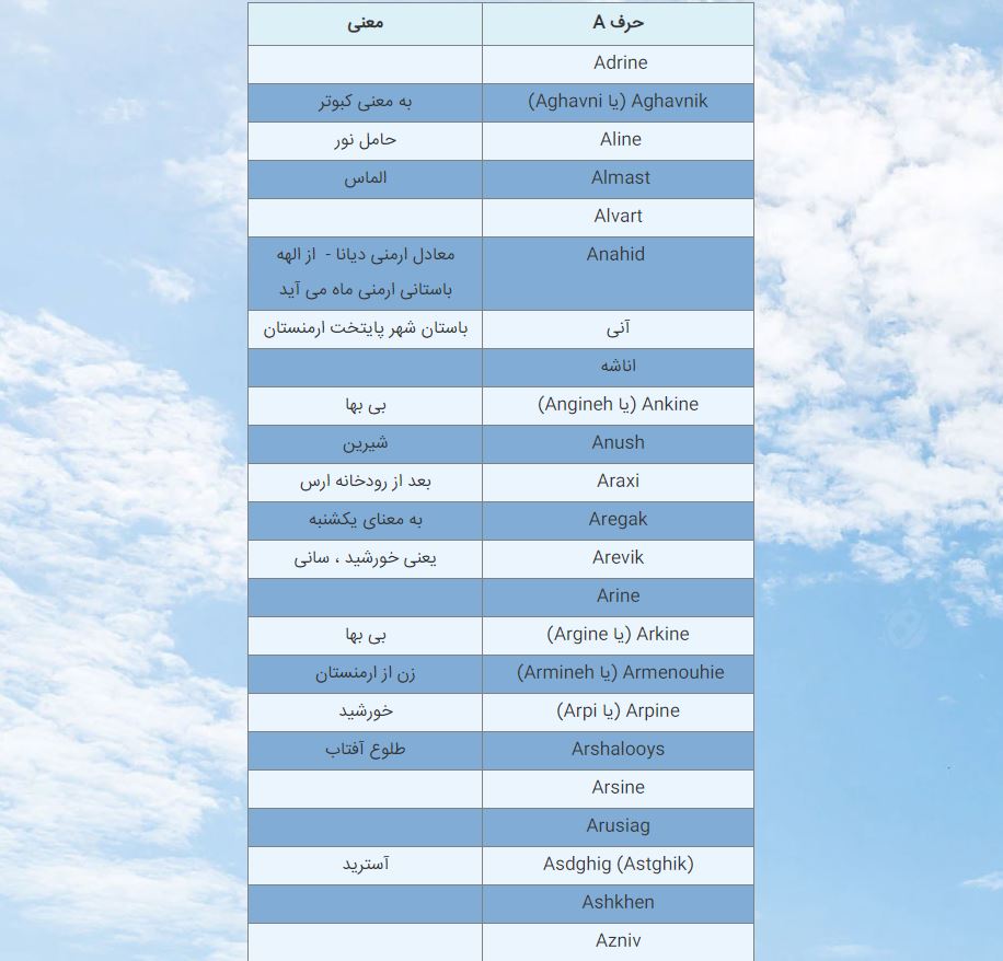 به گزارش سرویس اجتماعی ردنا (ادیان نیوز)، اسامی زیر جزء محبوبترین اسمهای دخترانه ارمنی میباشند که در این مطلب به ترتیب حروف الفبای انگلیسی برای شما عزیزان قرار دادهایم. این بخش با کمک بازدیدکنندگان بهروزرسانی میگردد.