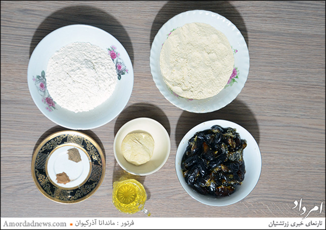 جوانهی گندم خشک شده آرد شده (سن) ۲۵۰ گرم، روغن دو قاشق سوپخوری، آرد گندم ۲۵۰ گرم، دارچین نیم قاشق چایخوری، خمیر مایه آماده یک قاشق سوپخوری، هل ساییده نیم قاشق چایخوری، خرمای تازه هسته گرفته یک جعبه