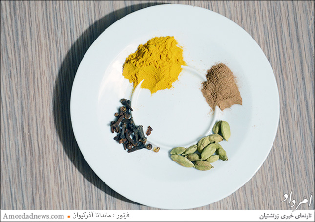زردچوبه یک قاشق مرباخوری، دارچین نصف قاشق چایخوری، جوز هندی و میخک یک چهارم قاشق چایخوری