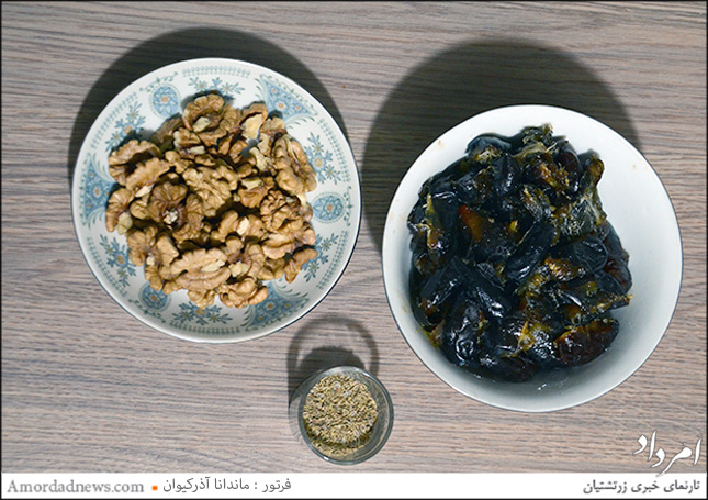 خرما به تعداد دلخواه، رازیانه یک قاشق سوپخوری، گردو خرد شده ۱۰۰ گرم