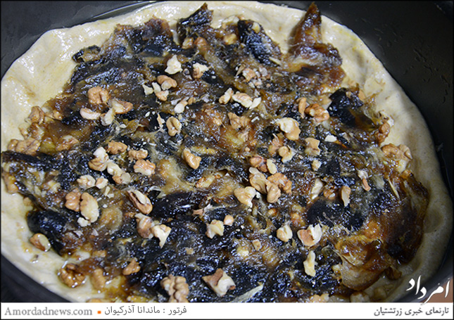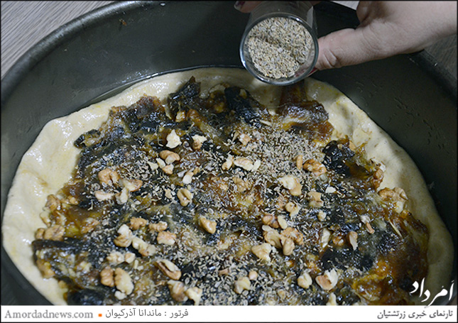 مواد بالا را کامل مخلوط کرده و در میان خمیر پخش میکنیم.