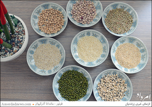 مواد لازم: ماش، عدس، نخود، لوبیا سفید، لوبیا قرمز، لوبیا چشم بلبلی از هر کدام یک پیمانه، گندم، جو از هر کدام نصف پیمانه، برنج یک قاشق سوپخوری، چغندر خلال شده در صورت تمایل، نمک و فلفل به مقدار لازم