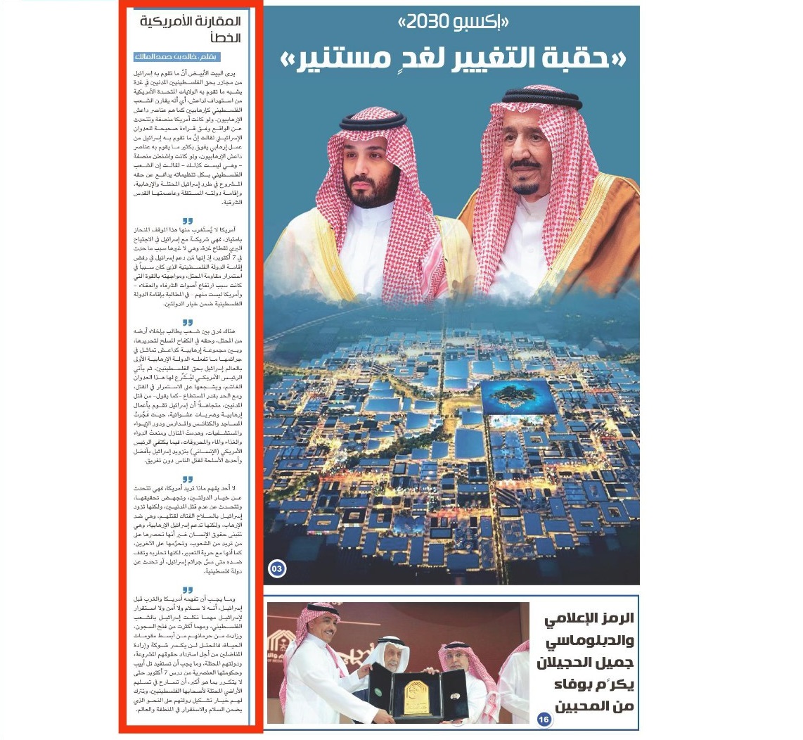 به گزارش ردنا (ادیان نیوز)، درحالیکه سیاست رسمی و غیر رسمی سعودی همچنان روی خوشی به حماس نشان نمیدهد، خالد المالک نویسنده و روزنامهنگار، و رئیس تحریریه روزنامه “الجزیره” در یادداشتی با عنوان «مقایسه نادرست آمریکا»، مقایسه ایالات متحده بین مقاومت فلسطین و داعش را مردود دانسته و تأکید کرده است: اسرائیل اولین کشور تروریست جهان است و تنها در صورتی روی صلح، امنیت و ثبات را خواهد دید که سرزمینهای اشغالی به صاحبانش بازگردد و کشور فلسطین در آن برپا شود.