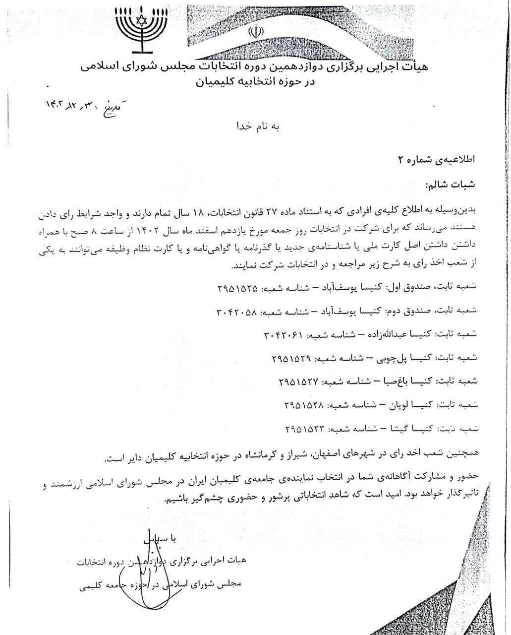 اطلاعیه شماره ۲ هیات اجرایی برگزاری دوازدهمین دوره انتخابات مجلس شورای اسلامی در حوزه انتخابی کلیمیان – روابط عمومی انجمن کلیمیان تهران