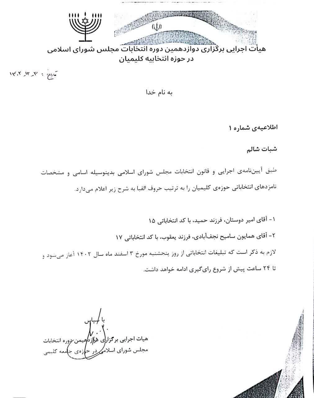 هیات اجرایی برگزاری دوازدهمین دوره انتخابات مجلس شورای اسلامی در حوزه انتخابی کلیمیان – روابط عمومی انجمن کلیمیان تهران به شرح زیر است.