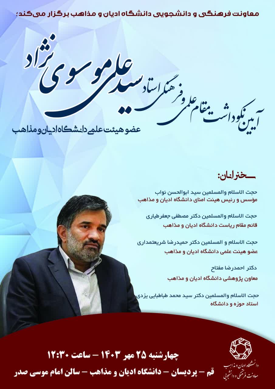 با حضور شخصیتهای حوزوی و دانشگاهی«آیین نکوداشت مقام علمی و فرهنگی استاد سید علی موسوی نژاد» برگزار میشود.