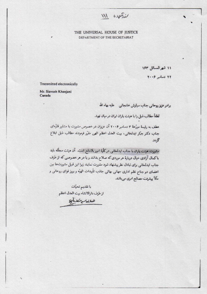 پیام بیتالعدل خطاب به کنفرانس هیئتهای مشاورین قارهای، ۲۹ دسامبر ۲۰۱۵. نقل از سخنرانی جبار ایدلخانی عضو هیئت مشاورین قارهای بهایی و مشاور بیتالعدل در امور ایران، در کلاس دو روزه برگزارشده در مارچ ۲۰۱۶ در دبی برای برخی از بهاییان ایران.