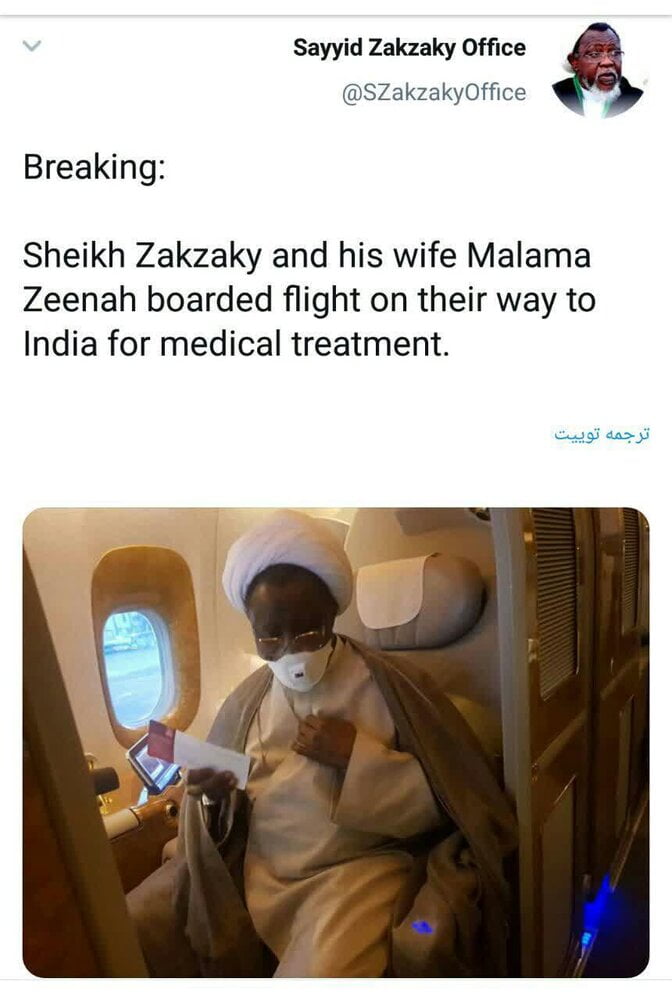 در این توئیت آمده است: شیخ زکزاکی و همسرش در سفر هوایی برای درمان به هند سفر کردند.