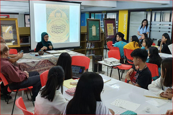 سخنرانی تندیس تقوی، بانوی خوشنویس ایرانی در مدرسه وابسته به دانشگاه «سنت پل» فیلیپین