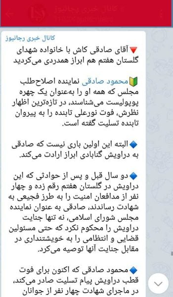 «طعنه زدهاند که چرا صادقی درگذشت نورعلی تابنده را تسلیت گفته ولی شهادت مدافعان امنیت را محکوم نکرده؛ اولا تسلیت رسمی اخلاقی است. ثانیاً ریختن خون محکوم است چه از حافظان امنیت چه از مردم.ثالثا منازعات اجتماعی را باید بهگونهای حل کرد که نه خون درویش بریزد نه خون حافظ امنیت».