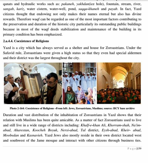 به گزارش ردنا (ادیاننیوز)؛ زندگی مسالمتآمیز ادیان در یزد، مسئلهای بسیار مهم نه تنها در ایران بلکه در جهان به شمار میرود که در ثبت جهانی یزد از سوی یونسکو نیز مورد تاکید قرار گرفته است، به طوری که در پرونده ثبت جهانی یزد نیز این مسئله مورد بررسی قرار گرفته و یکی از موارد مورد توجه یونسکو در ثبت جهانی بخشی از بافت تاریخی این شهر نیز مربوط به همین ویژگی است.