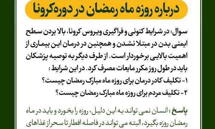 آیتالله ناصر مکارم شیرازی از مراجع تقلید نظر فقهی خود را نسبت به روزه ماه رمضان در دوره شیوع کرونا را عنوان کرد و خوردن روزه را منوط به برخی شروط دانست.