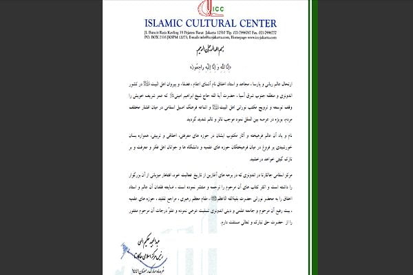 ضایعه فقدان آن عالم و استاد اخلاق را به محضر نورانی حضرت بقیهالله الاعظم، مقام معظم رهبری، مراجع تقلید، حوزههای علمیه، بیت آن مرحوم و جامعه علمی و دینی اندونزی تسلیت عرض کرده و علو درجات آن مرحوم را از حضرت حق تبارک و تعالی مسئلت دارم.»