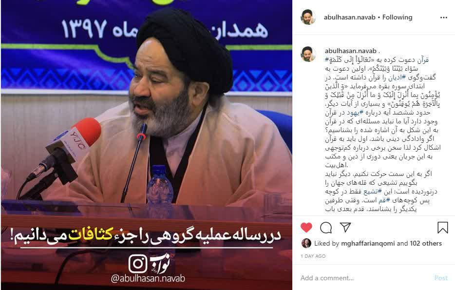 به گزارش ردنا (ادیان نیوز)، حجت الاسلام والمسلمین سید ابوالحسن نواب، رئیس دانشگاه ادیان و مذاهب در یادداشتی اینستاگرامی نوشت: