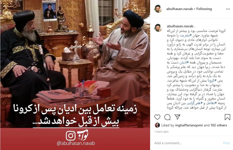 به گزارش ردنا (ادیان نیوز)، حجت الاسلام والمسلمین ابوالحسن نواب، در یادداشتی اینستاگرامی بیان کرد: