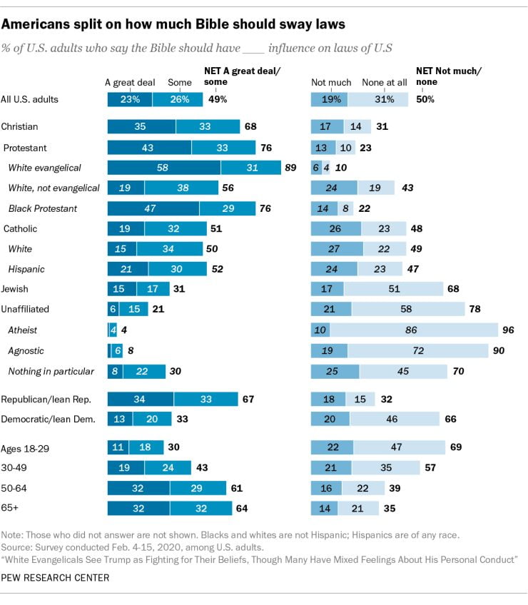 به گزارش ردنا (ادیاننیوز)، بر اساس نظرسنجی جدید مرکز تحقیقاتی پیو، امروزه حدود نیمی از امریکاییها (۴۹%) معتقدند انجیل باید تا حدودی بر قوانین امریکا مؤثر باشد، درحالیکه ۲۳ درصد از این ۴۹ درصد معتقدند کتاب مقدس باید تأثیر قابلتوجهی بر قانون بگذارد. در میان مسیحیان امریکا حدود دوسوم (۶۸%) خواستار نقش انجیل در روند قانونگذاری در امریکا هستند و این تعداد در بین پروتستانهای انجیلی به ۸۹ درصد میرسد.