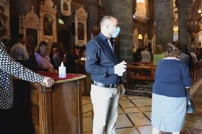 در جلوی کلیسای ملکیت شهر دمشق مسیحیان با ضدعفونی دست های خود آیین های کلیسایی خود را به جای آوردند.