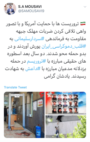 به گزارش ردنا (ادیان نیوز)، سید عباس موسوی سخنگوی وزارت امور خارجه جمهوری اسلامی ایران امروز (شنبه) در توئیتی در سالروز حمله تروریستی به مجلس شورای اسلامی و حرم امام (ره) نوشت: «تروریستها با حمایت آمریکا و با تصور واهی تلافی کردن ضربات مهلک جبهه مقاومت به فرماندهی سردار سلیمانی به قلب دموکراسی ایران یورش آوردند و در بدو حمله محو شدند. دو سال بعد اسطوره های حقیقی مبارزه با تروریسم در حمله بزدلانه مدعیان مبارزه با داعش به شهادت رسیدند. یادشان گرامی»