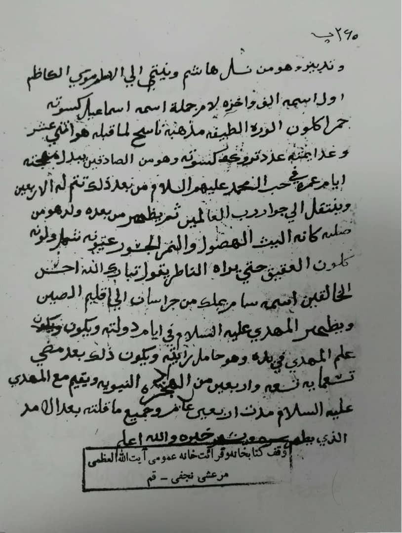 ثمّ بعد ذلک: یظهر صبیّ حدَث السّن، له شأنٌ عظیم، صاحب عقل و فضل و تدبیر، و هو من نسل هاشم، و ینتمی الی الامام موسی الکاظم، اوّل اسمه الف و آخره ل، من جمله اسمه اسماعیل، کِسوته حُمُرا کلون الو[ر]ده اللطیفه، مذهبه ناسخ لما قبله، هو اثنی عشر و عدد ائمته عدد تُرُوک کسوته، و هو من الصادقین ببذل مُهجته ایّام عمره فی حُبّ آل محمد علیهم السلام.