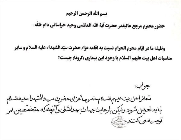 آیتالله وحید خراسانی در پاسخ به سؤالی، نظر خود را درباره برگزاری مراسم عزای سید الشهدا (ع) در ماه محرم در ایام کرونایی بیان کرد.