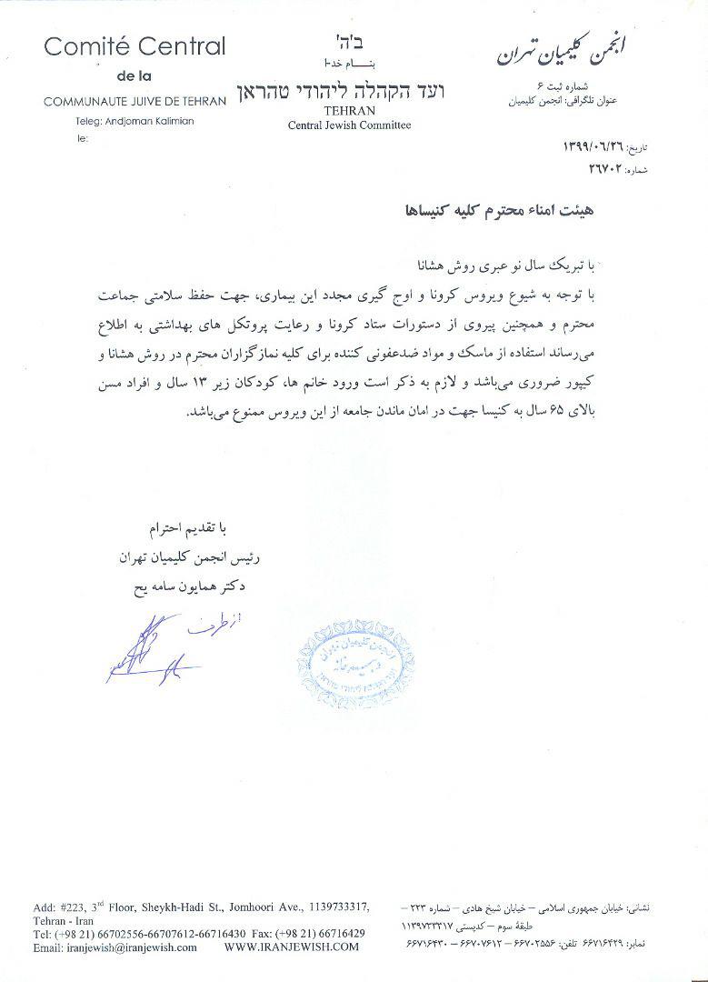 با آغاز سال نو عبری روش هشانا شیوه نامه رعایت پروتکل های بهداشتی از سوی انجمن کلیمیان تهران به کنیساهای ایران ابلاغ شد