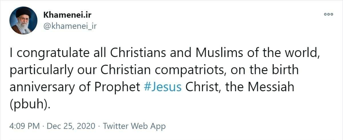 به گزارش ردنا (ادیان نیوز)، حضرت آیتالله خامنهای رهبر معظم انقلاب در پیامی توئیتری که به زبان انگلیسی منتشر شد، عید میلاد حضرت مسیح (ع) را به مسیحیان ایران و جهان تبریک گفتند.