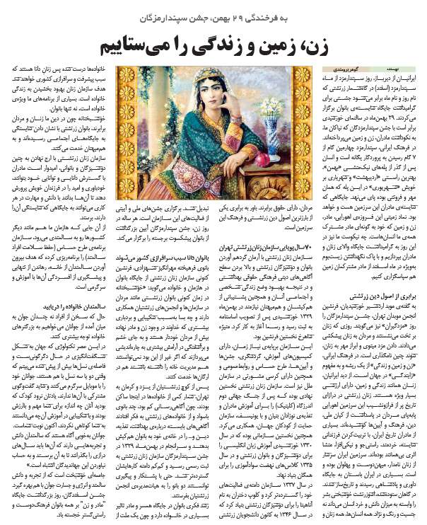 در این نوشتار که به بهانهی جشن سپندارمزگان و همچنین هفتاد سالگی سازمان زنان زرتشتی به نگارش در آمده است، موبد اردشیر خورشیدیان فرنشین انجمن موبدان و مهرانگیز شهزادی، فرنشین کنونی سازمان زنان زرتشتی از دیدگاه خود پیرامون جشن سپندارمزگان و جایگاه زنان در هازمان و خانواده سخن گفتهاند.
