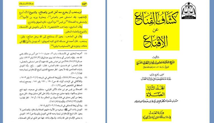 «وَیُسْتَحَبُّ أَنْ یَخْرُجَ مَعَهُ أَهْلُ الدِّینِ وَالصَّلَاحِ وَالشُّیُوخِ) لِأَنَّهُ أَسْرَعُ لِإِجَابَتِهِمْ، وَقَدْ اسْتَسْقَى عُمَرُ بِالْعَبَّاسِ وَمُعَاوِیَهُ یَزِیدَ بْنِ الْأَسْوَدِ، وَاسْتَسْقَى بِهِ الضَّحَّاکُ بْنُ قَیْسٍ مَرَّهً أُخْرَى ذَکَرَهُ الْمُوَفَّقُ وَالشَّارِحُ وَقَالَ السَّامِرِیُّ، وَصَاحِبُ التَّلْخِیصِ: لَا بَأْسَ بِالتَّوَسُّلِ فِی الِاسْتِسْقَاءِ بِالشُّیُوخِ وَالْعُلَمَاءِ الْمُتَّقِینَ وَقَالَ فِی الْمَذْهَبِ یَجُوزُ أَنْ، یُسْتَشْفَعُ إلَى اللَّهِ بِرَجُلٍ صَالِحٍ وَقِیلَ: یُسْتَحَبُّ قَالَ أَحْمَدُ فِی مَنْسَکِهِ الَّذِی کَتَبَهُ لِلْمَرُّوذِیِّ أَنَّهُ یَتَوَسَّلُ بِالنَّبِیِّ فِی دُعَائِهِ وَجَزَمَ بِهِ فِی الْمُسْتَوْعِبِ وَغَیْرِهِ»[۱]