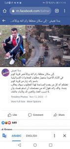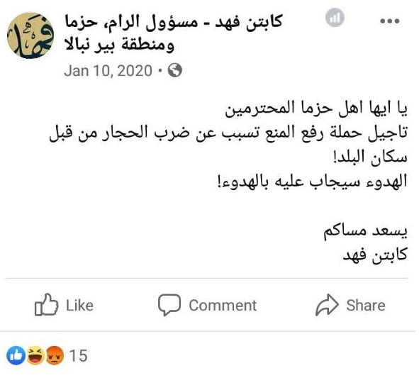 کاپتان فهد – مسئول شاباک در مناطق الرام، حزما و بیت نبالا پستی را به اشتراک گذاشت و در آن نوشت: