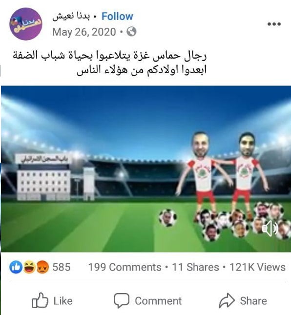 به عنوان مثال پیج های شاباک ویدئویی کوتاه و پَست از دو آزاده فلسطینی اهل کرانه باختری که به غزه تبعید شدند، را درحالی که مانند یک توپ فوتبال جوانان کرانه باختری را یکی پس از دیگری به سمت زندان های رژیم صهیونیستی پاس کاری میکنند به تصویر کشانده، به همراه زیرنویسی با این مضمون «مردان حماس در غزه زندگی جوانان کرانه باختری را به بازی گرفتند، فرزندانتان را از این مردم دور کنید» منتشر نمودند.(۹)